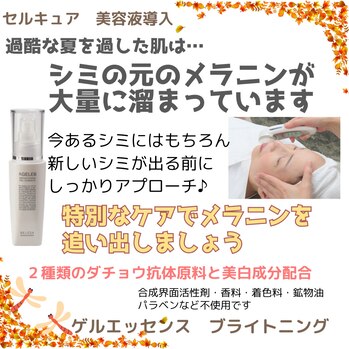 こんにちはブーケです♪紫外線量が少し弱まってきた秋こそお肌の奥に溜まっているシミの元のメラニンを1日も早く追い出すために美白のお手入れをしましょう! おーっ(#^.^#)/秋限定