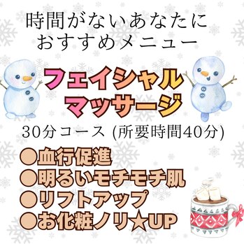 慌ただしい年の瀬に時短メニュー3種のご紹介です(*´ω`*)(1)フェイシャルマッサージで血行促進気温が下がり血流も悪くなりお肌に老廃物も溜まりがちです肌細胞に必要な酸素や栄養