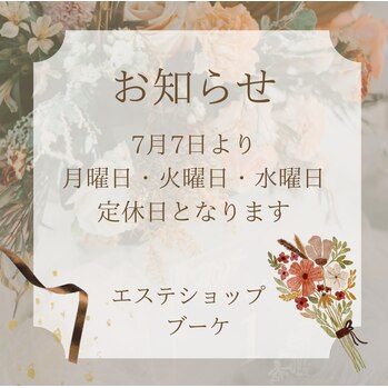 こんにちはブーケです♪7月より定休日が変わります現在 月曜日・火曜日 ↓↓↓月曜日・火曜日・水曜日となります暑くなってきましたので皆様水分補給をしっかりされてくださ