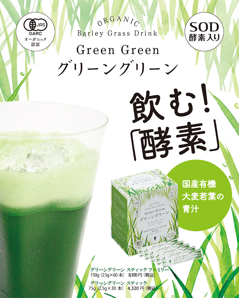グリーングリーンは有機JAS認証を受けた大麦若葉を非加熱で粉末化した吸収力の高い青汁です。